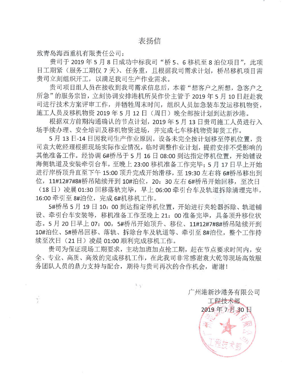 廣州港新沙港務(wù)有限公司發(fā)來(lái)了感謝信