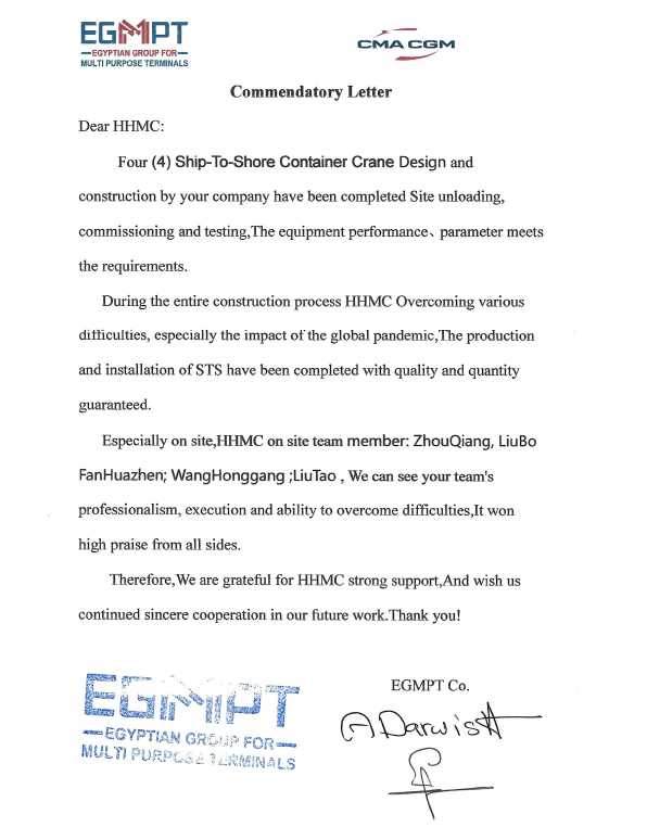 亞歷山大港多用途碼頭為埃及國家重點(diǎn)項(xiàng)目,埃及國家領(lǐng)導(dǎo)人員高度關(guān)注該項(xiàng)目進(jìn)展。岸橋到達(dá)用戶碼頭后,項(xiàng)目組嚴(yán)格按照策劃節(jié)點(diǎn)穩(wěn)步推進(jìn)每天工作,確保當(dāng)日事當(dāng)日畢,最終在整個(gè)項(xiàng)目組通力協(xié)作以及用戶的積極配合支持下,岸橋順利完成交付,并按計(jì)劃進(jìn)入保產(chǎn)。期間,埃及總理、交通部部長對(duì)海西重機(jī)產(chǎn)品及現(xiàn)場(chǎng)項(xiàng)目團(tuán)隊(duì)給予了充分肯定,多家當(dāng)?shù)孛襟w對(duì)此進(jìn)行了專題報(bào)道。用戶特地向我司發(fā)來一封表揚(yáng)信以示感謝。