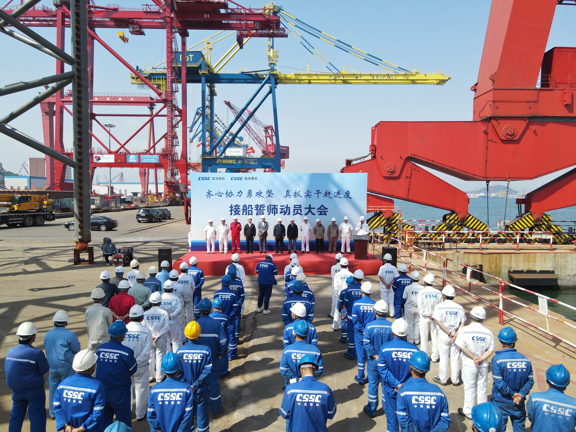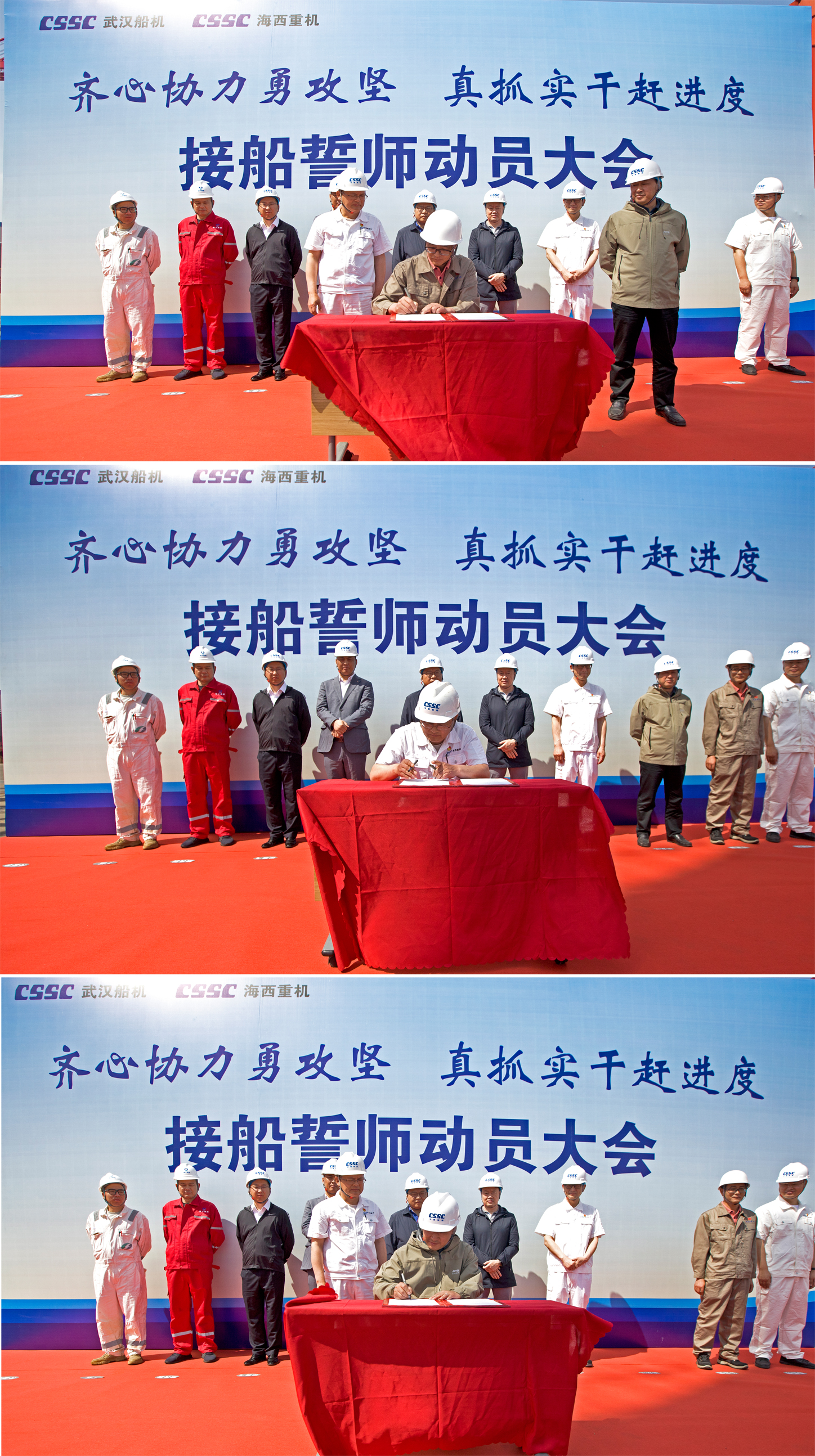 為了明確目標(biāo)、凝聚共識(shí)、齊心協(xié)力、克難攻堅(jiān),亮明迎難而上的堅(jiān)定信心和堅(jiān)強(qiáng)決心,動(dòng)員全員上下持續(xù)營(yíng)造濃厚干事氛圍,掀起“齊心協(xié)力勇攻堅(jiān),真抓實(shí)干趕進(jìn)度”的高潮,全力以赴打好海工項(xiàng)目集中攻堅(jiān)戰(zhàn),5月25日上午,中國(guó)船舶集團(tuán)旗下武漢船機(jī)海西重機(jī)公司在生產(chǎn)現(xiàn)場(chǎng)組織開展接船誓師動(dòng)員大會(huì)。華夏金融租賃有限公司、北京神大集團(tuán)有限公司、飛勵(lì)特船舶管理有限公司、大津重工泰州分公司、江陰雙馬重工裝備有限公司、武漢船機(jī)海西重機(jī)等相關(guān)方參加本次動(dòng)員大會(huì)。