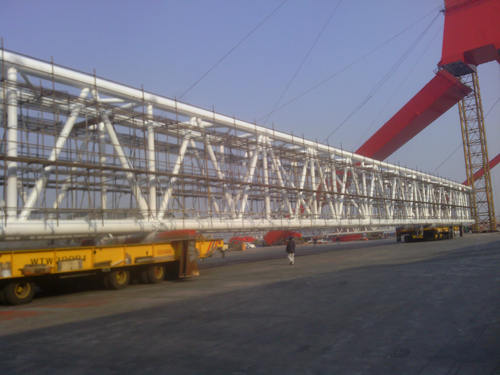 F1是我公司承造的3600T雙臂架變幅浮式起重機項目。臂架中段單片長113米,寬4.5米,高7米。鑒于該構(gòu)件超長超重,我們采用兩臺平板車協(xié)同作業(yè)的方案。