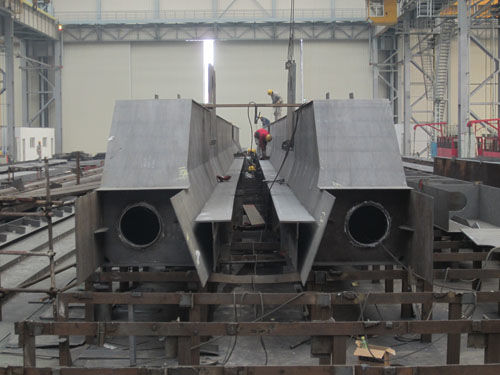 G126為一臺鹽城大豐港的集裝箱裝卸起重機,該項目13年1月初開工,5月底交付使用,中間要跨越春節(jié),工期異常緊張。為了確保該項目按期交貨,項目部、鋼構(gòu)部、工藝部、品質(zhì)部在項目開工前就進行了多次溝通,明確了生產(chǎn)任務(wù)。工藝部總結(jié)以往經(jīng)驗,并積極采納承制單位建議,優(yōu)化了制作工藝。品質(zhì)部在加強關(guān)鍵點控制的基礎(chǔ)上,明確、簡化了檢驗流程。鋼構(gòu)部按時間分割生產(chǎn)節(jié)點,嚴控人員及施工進度,制定了一系列的保障措施。目前G126項目開工僅半月時間,所有箱體結(jié)構(gòu)均已裝配成形,部分構(gòu)件如門框上橫梁已處于完工報檢階段,施工難度相對較大的前、后大梁已開始承軌梁裝配作業(yè)。施工進度基本處于計劃控制范圍。