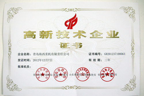 成為國家高新技術企業(yè),不僅是對公司技術水平和產(chǎn)品技術含量一個高標準的定性,而且是海西重機發(fā)展歷史上的里程碑,標志著青島海西重機從“海西制造”邁向了“海西創(chuàng)造”之路!