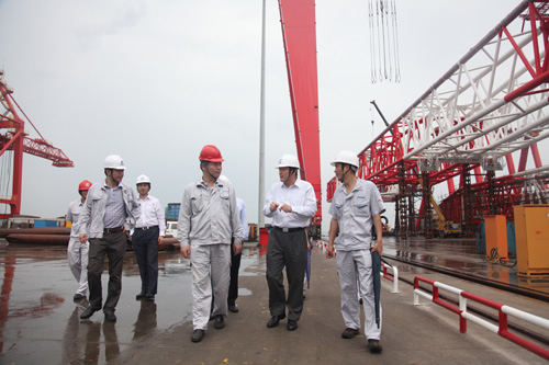 在參觀公司現(xiàn)場(chǎng)建成自用的1600噸龍門吊項(xiàng)目、正在吊裝上船的3600噸全回轉(zhuǎn)浮吊項(xiàng)目、面對(duì)公司的120米突堤碼頭以及繁忙的生產(chǎn)組裝現(xiàn)場(chǎng),董總對(duì)公司的經(jīng)營(yíng)發(fā)展態(tài)勢(shì)予以充分肯定。他說:在當(dāng)前市場(chǎng)經(jīng)濟(jì)低迷的形勢(shì)下,青島海西重機(jī)能夠抓住發(fā)展機(jī)遇,逆勢(shì)而上,尤其在技術(shù)創(chuàng)新和產(chǎn)品開發(fā)方面發(fā)揮了自身潛能,具有前瞻性和市場(chǎng)眼光,更是武漢船機(jī)公司在船市低迷的情況下,產(chǎn)品結(jié)構(gòu)調(diào)整的有力體現(xiàn)。董總特別對(duì)近期在煙臺(tái)、連云港、海南洋浦等港口項(xiàng)目投標(biāo)中,我司與上海振華同臺(tái)競(jìng)標(biāo)并連續(xù)奪得標(biāo)的給予了高度肯定。